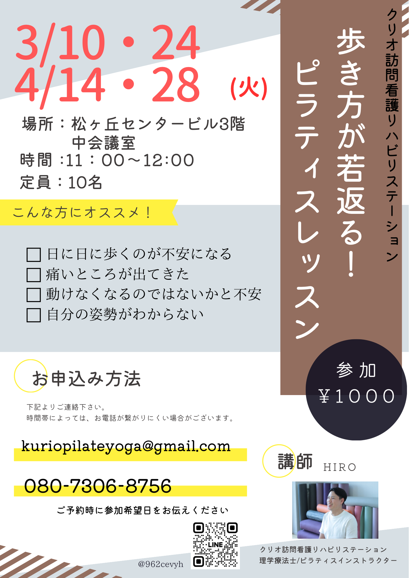 ⭕️3月10日・24日 『歩き方が若返る!ピラティスレッスン』 講師:HIRO 場所:松が丘センタービル 中会議室 時間:11:00〜12:00 定員:10名 料金:1000円 ▶︎参加年齢 70〜90代 ゆっくりしっかり動いていきます(運動量:★★)